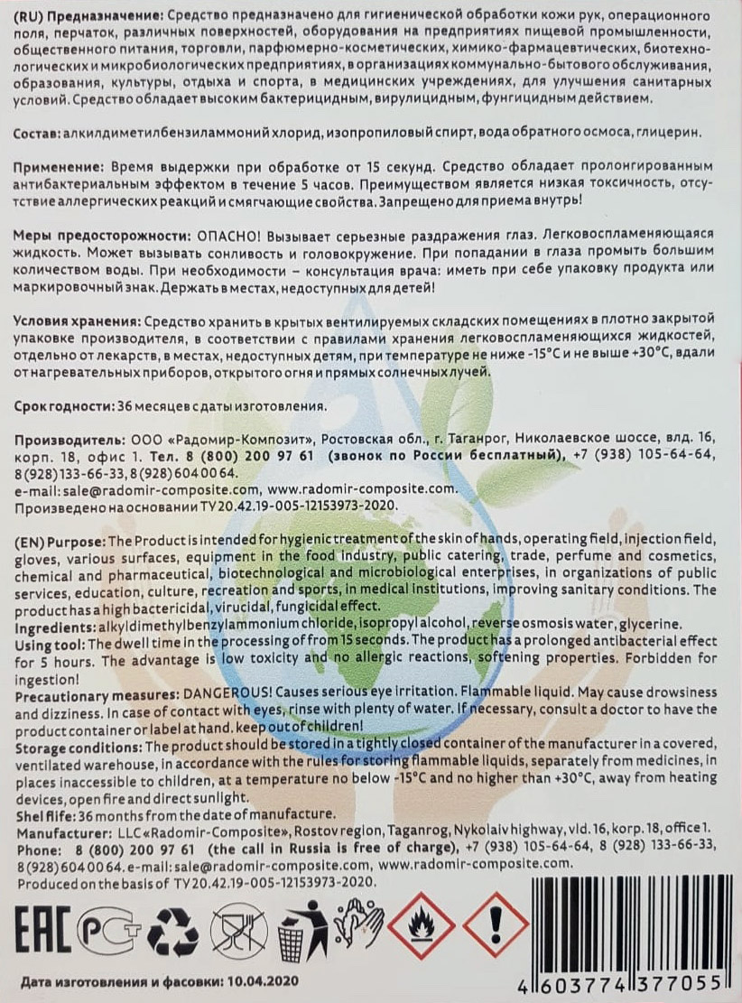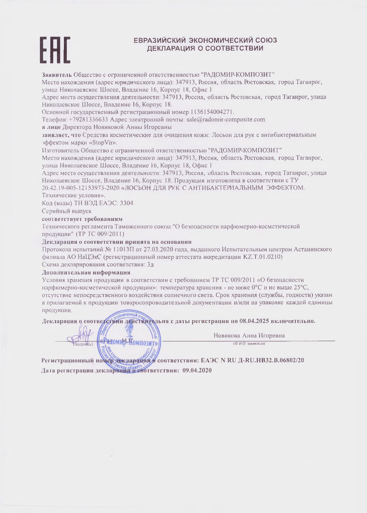 ООО "Радомир-Композит" предлагает Вам, антибактериальный лосьоны для рук – вещь, которая сейчас особенно важна для безопасности каждого. Предлагаемый лосьон для рук и поверхностей с антибактериальным эффектом марки «StopVir» от производителя! Лосьон на основе алкилдиметилбензиламмония хлорид и применяется как для: - гигиенической обработки кожи рук - стерилизации бытовых и медицинских помещений