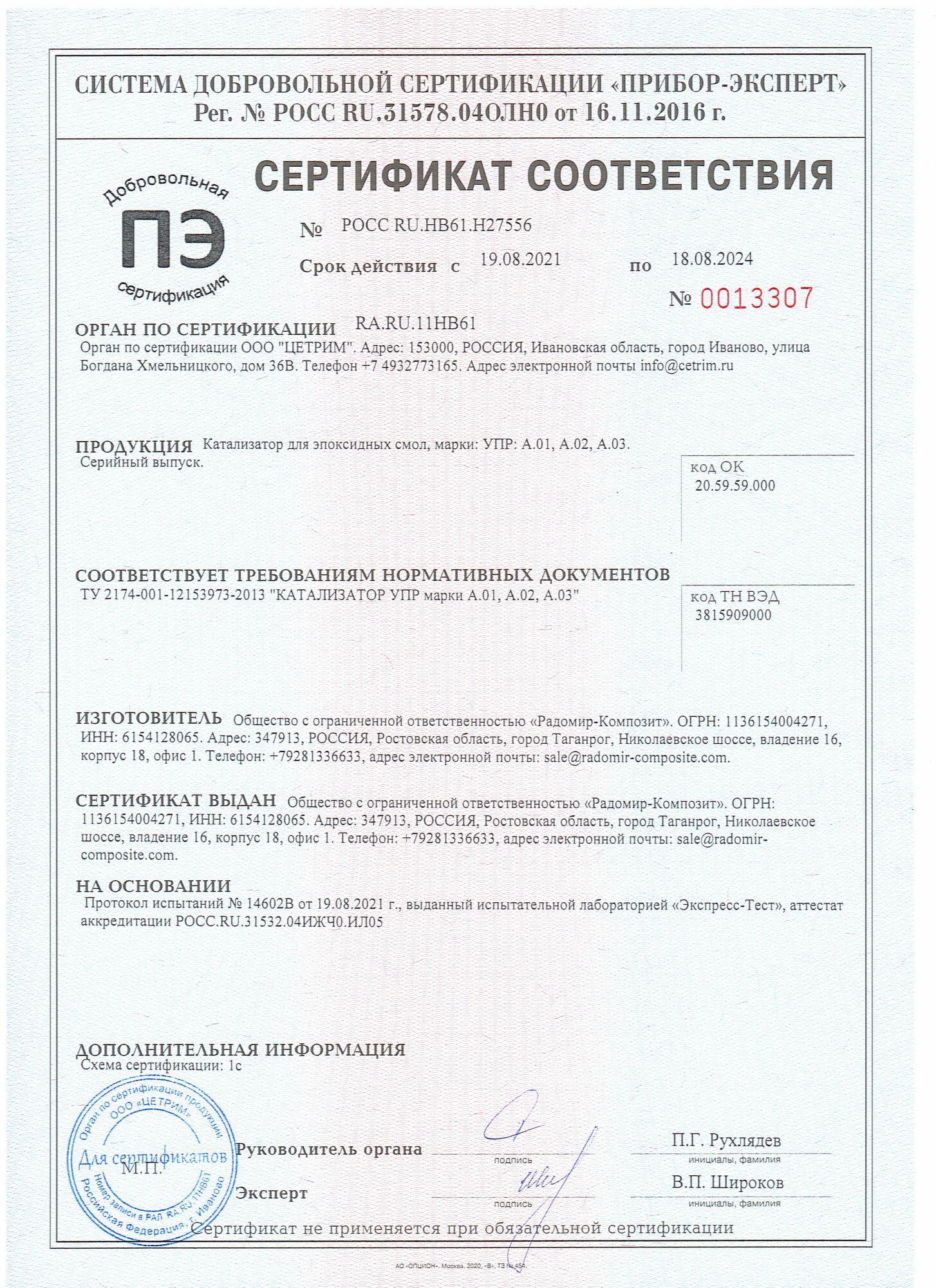 ООО "Радомир-Композит" предлагает Вам, Катализатор УПР А.01 (Ускоритель Полимеризации Радомир) собственного производства, для эпоксидных смол, который применяется в связующих для стеклопластиков в процессах пултрузии, экструзии, намотки. Содержит в своем составе поверхностно-активные вещества, эффективно разбавляющие эпоксидные смолы и придающие хороший пластифицирующий эффект, повышающие прочность, теплостойкость, эластичность, адгезию к стеклу (ровинги, маты).